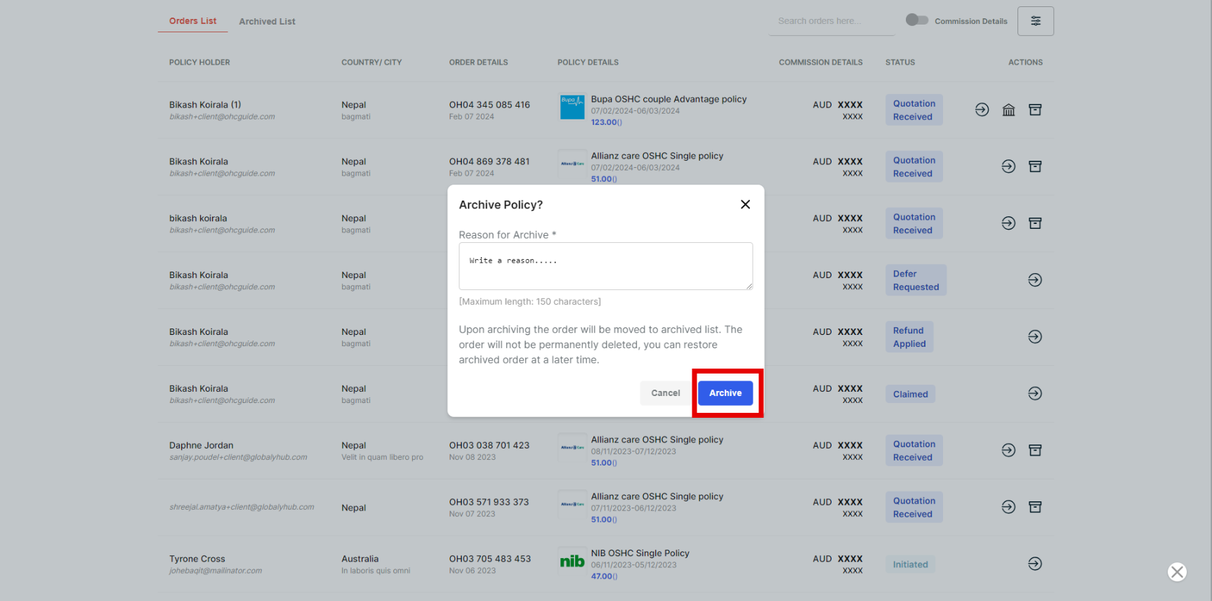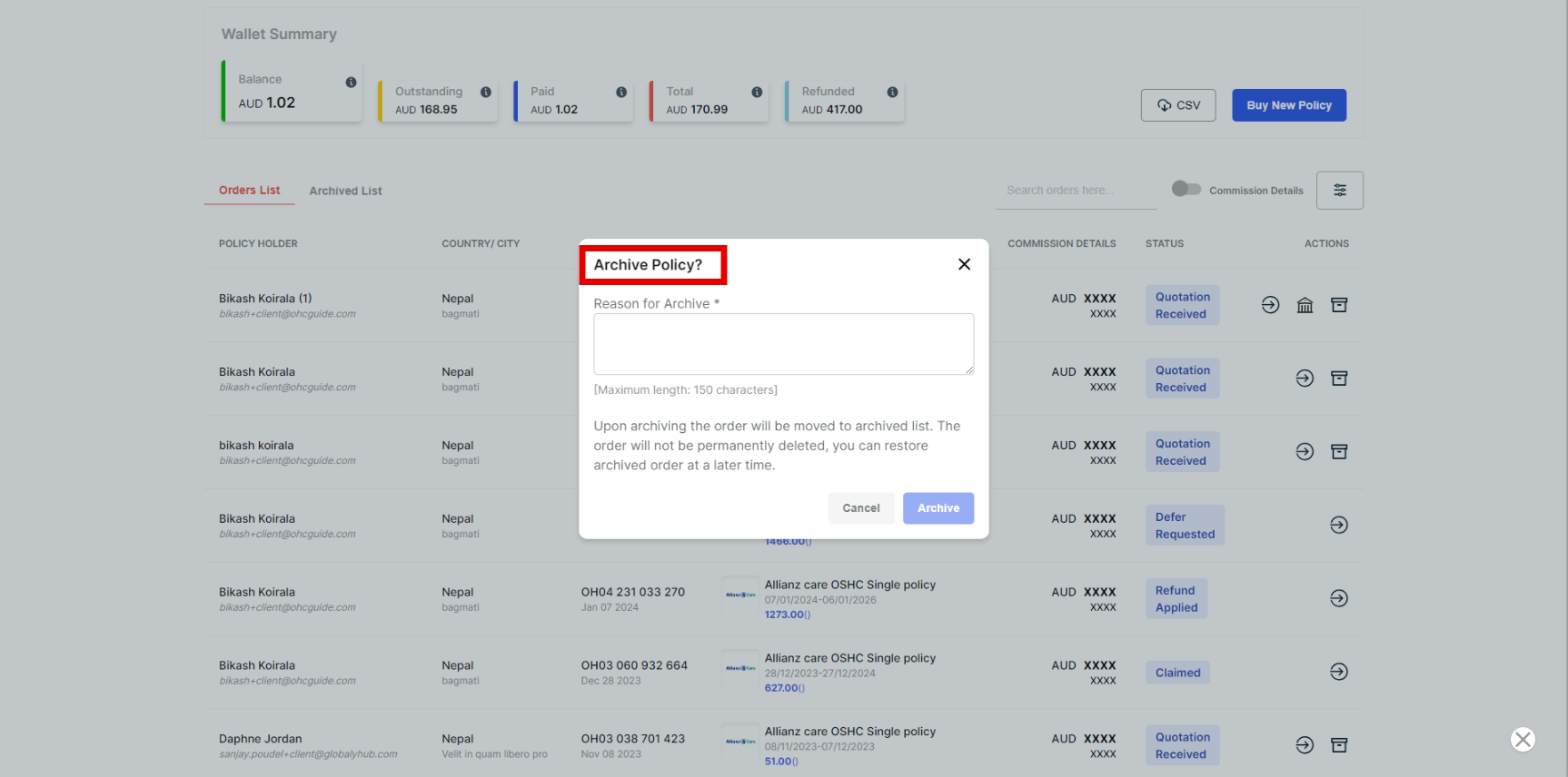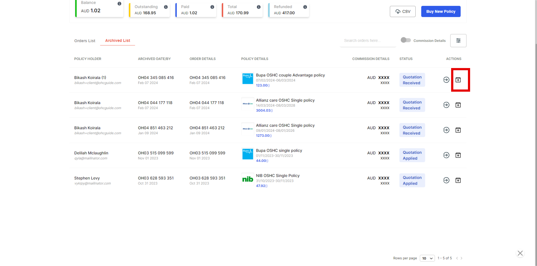Step 7 - Click on the Unarchive Policy button just below the Action button, and the policy will be restored to the order list.
