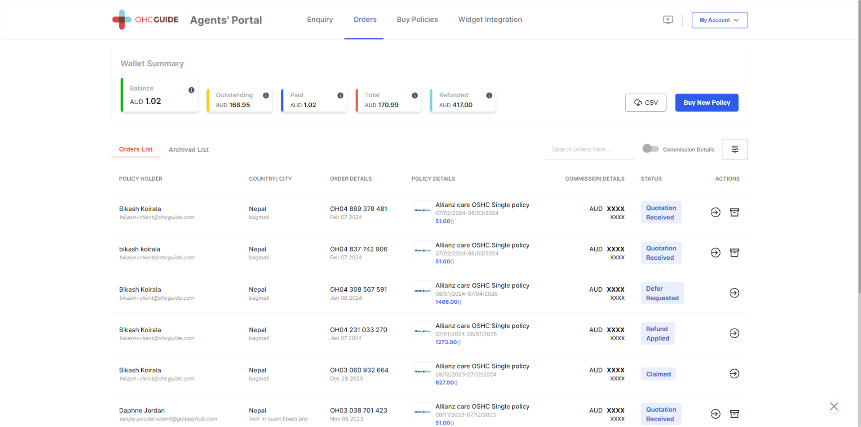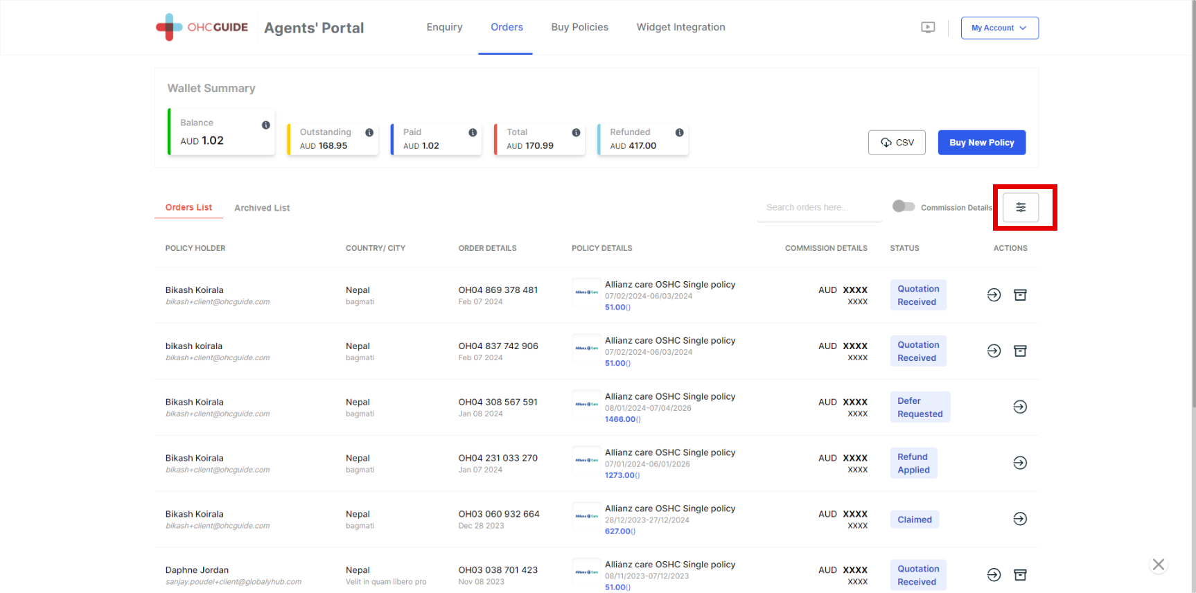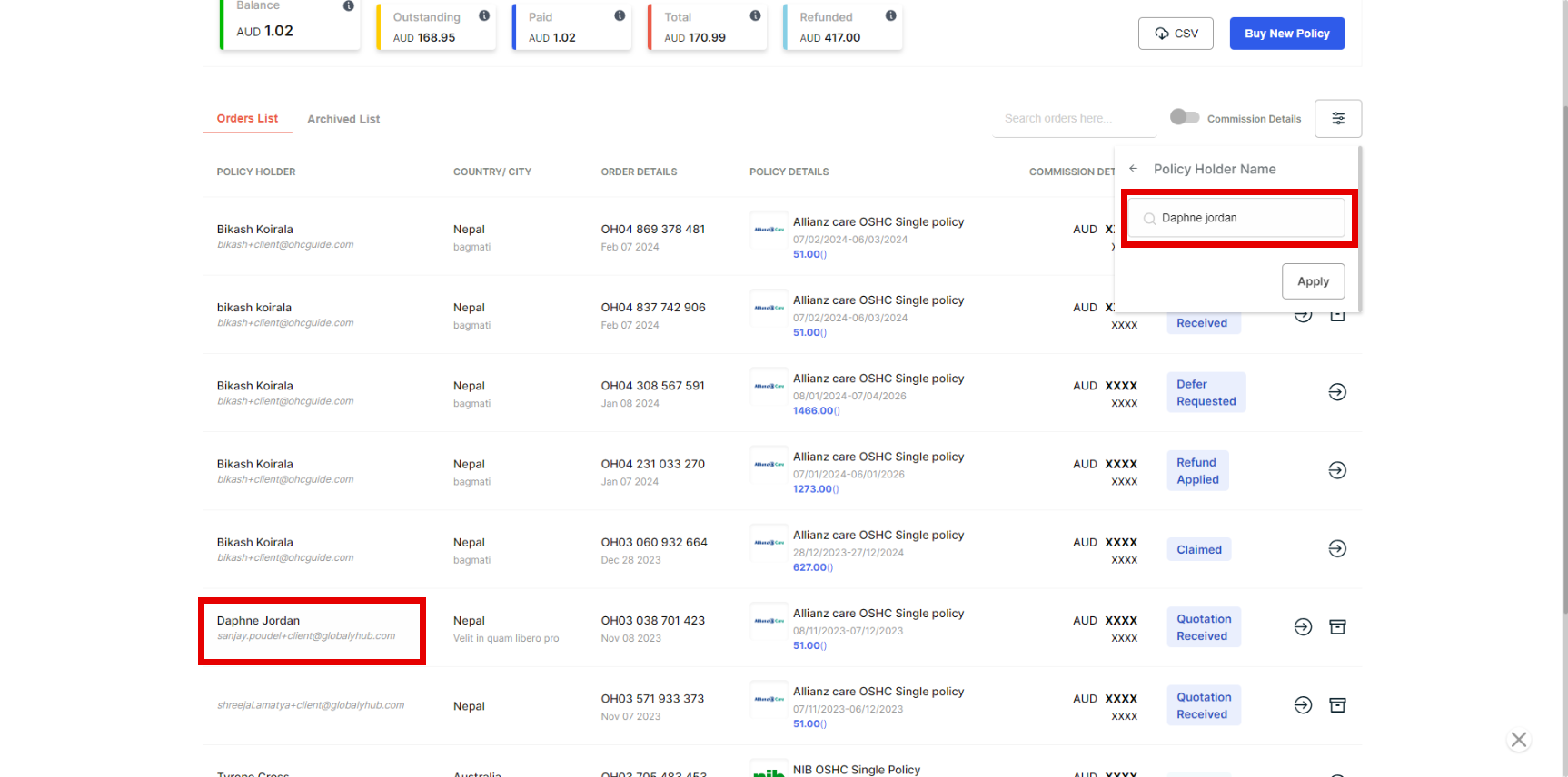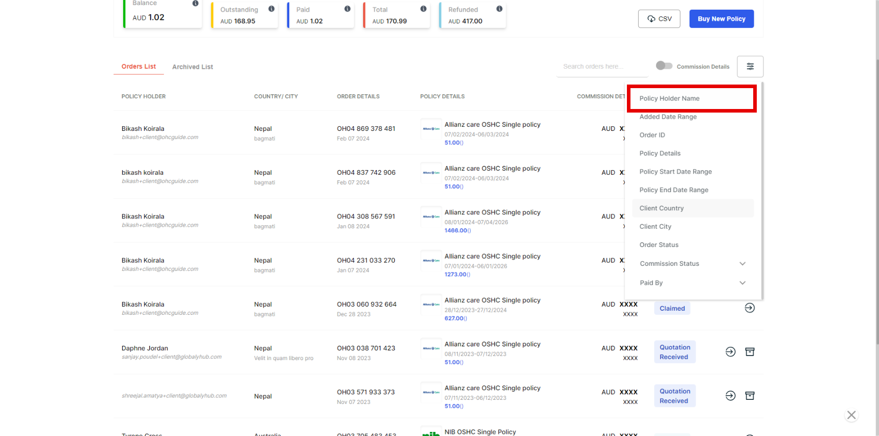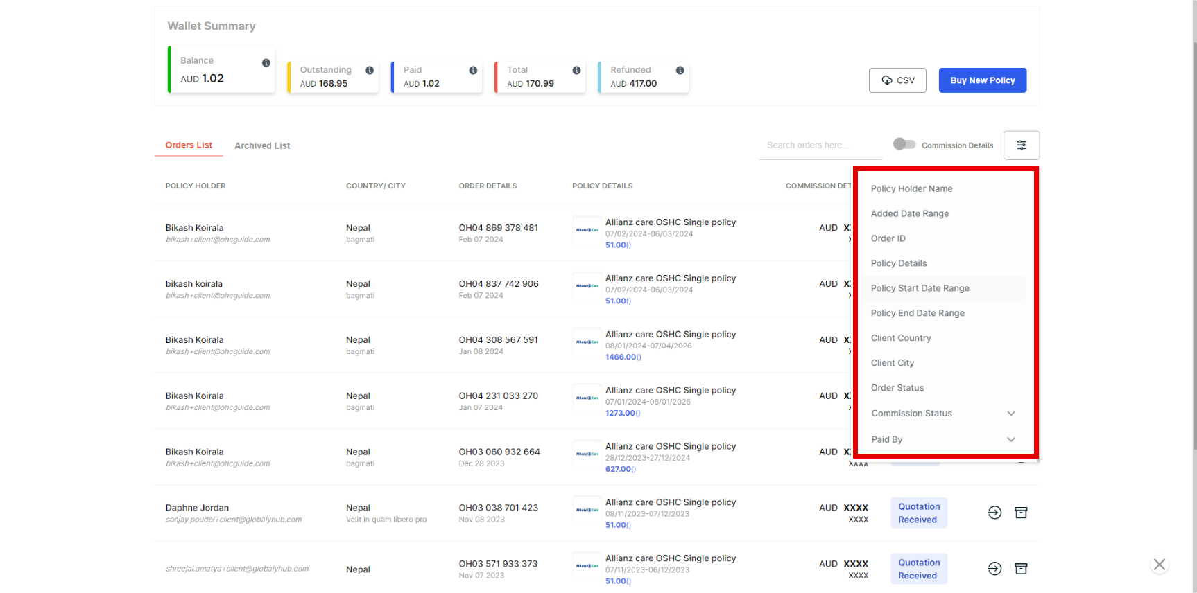 Note -Likewise, you can also use a filter to search for Order ID, Policy Details, Policy Start Date Range, Policy End Date, Client Country, Client City, Commission Status, and Paid By.