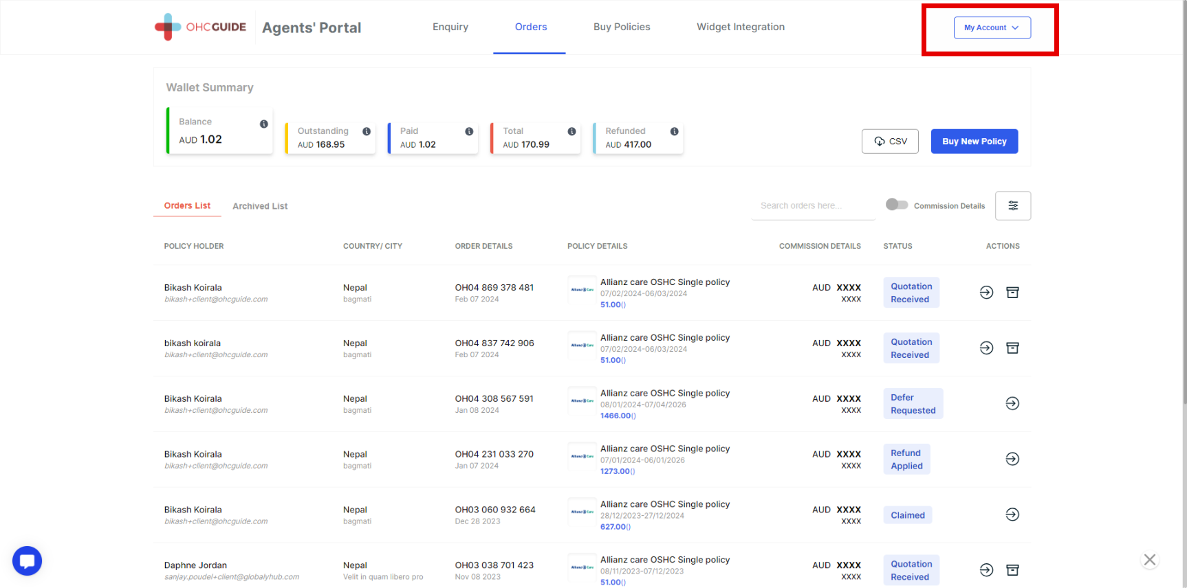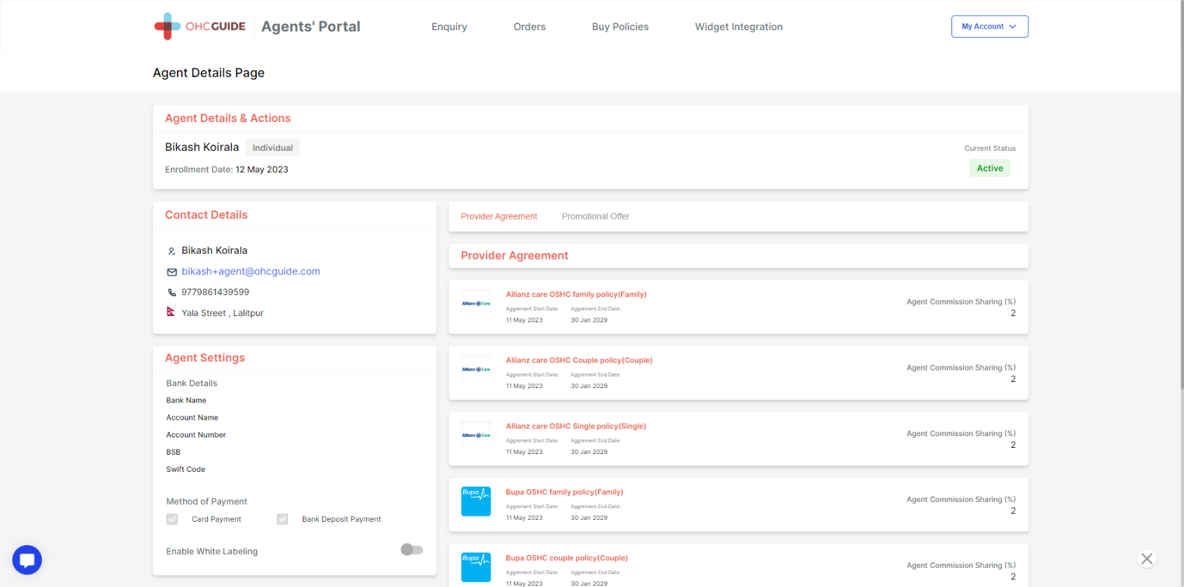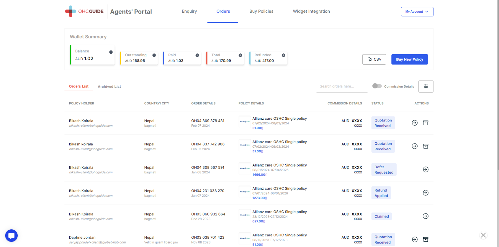 - Agent commission on different insurance policies (Allianz Care, Bupa, NIB, and Bupa Advantage)